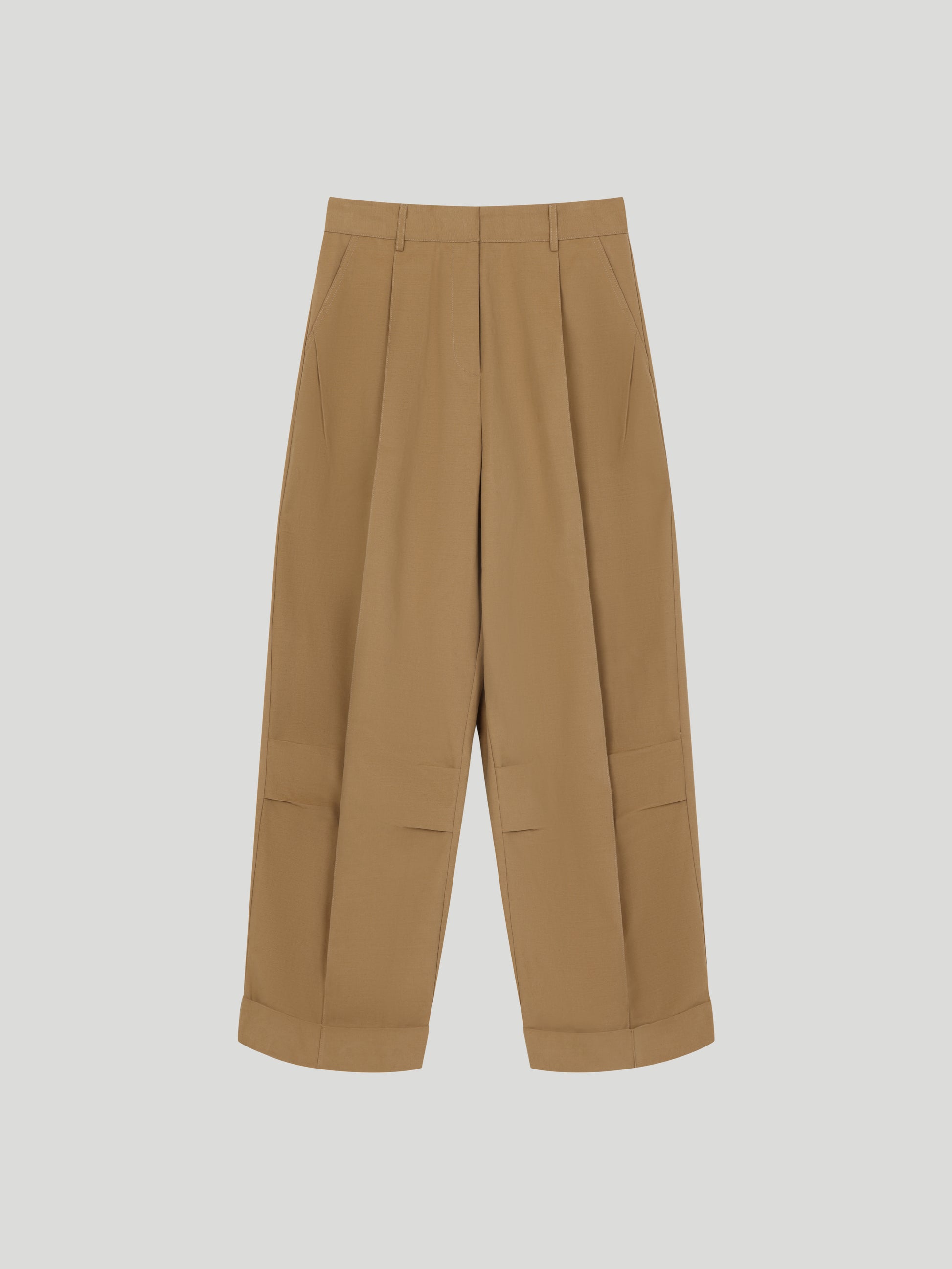 Crafted from soft, breathable cotton, these Curved Pleat Pants offer a modern blend of comfort and sophistication. The tailored curved pleats at the front create a subtle volume and flattering silhouette, while the relaxed fit ensures ease of movement for everyday wear.