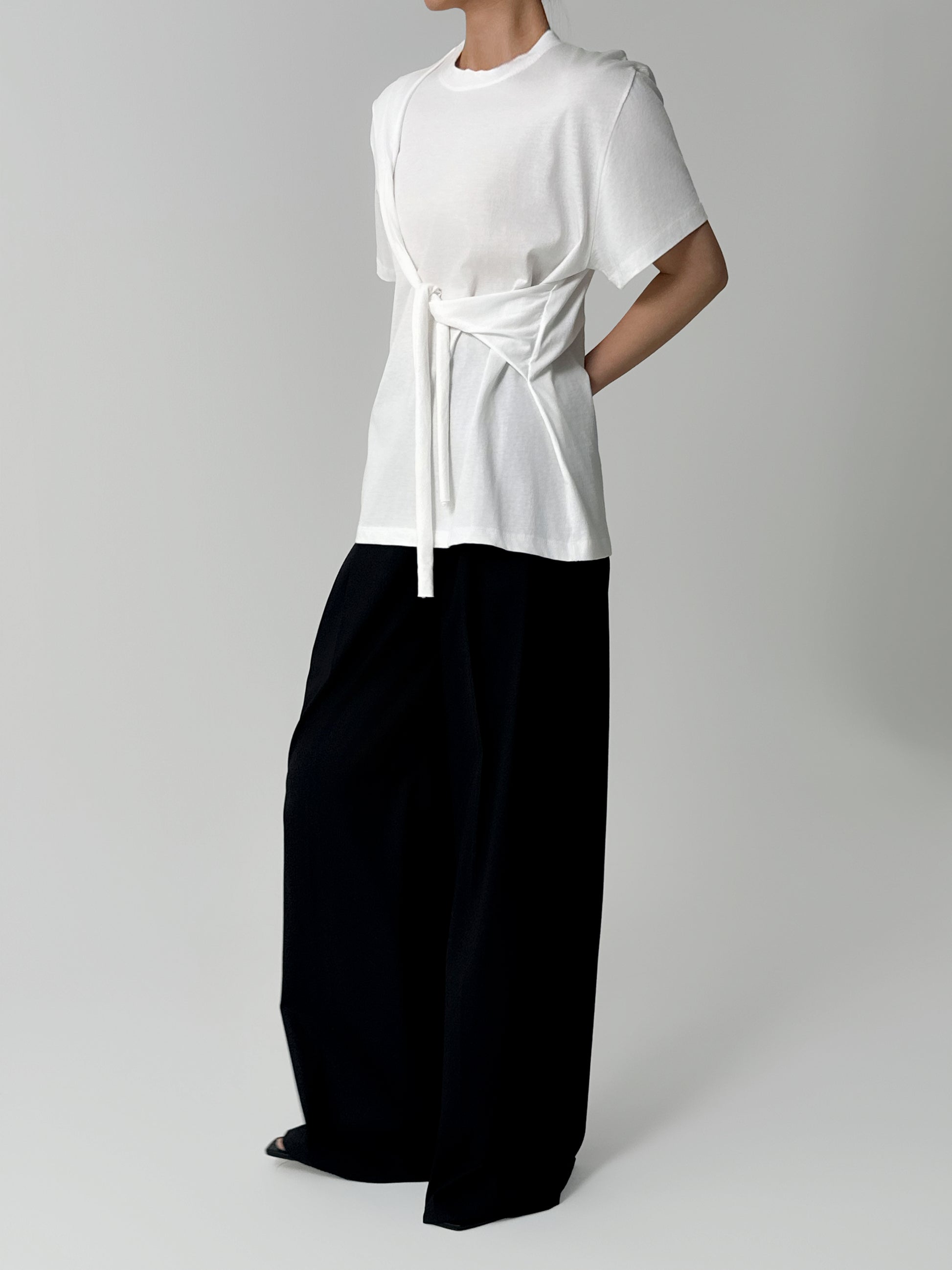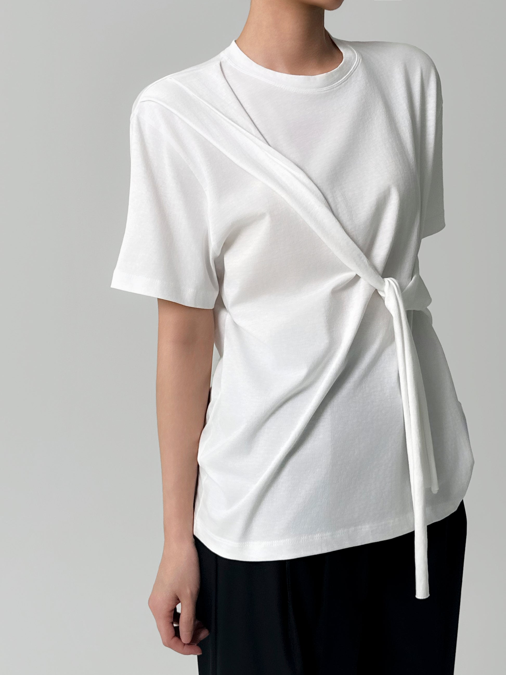 Elevate your wardrobe with the Elin Tie Front Cotton Top—a sculptural reinterpretation of the everyday tee. Crafted from 100% breathable cotton, it features a clean round neckline and an elegant tie-front detail that adds quiet structure and modern femininity.