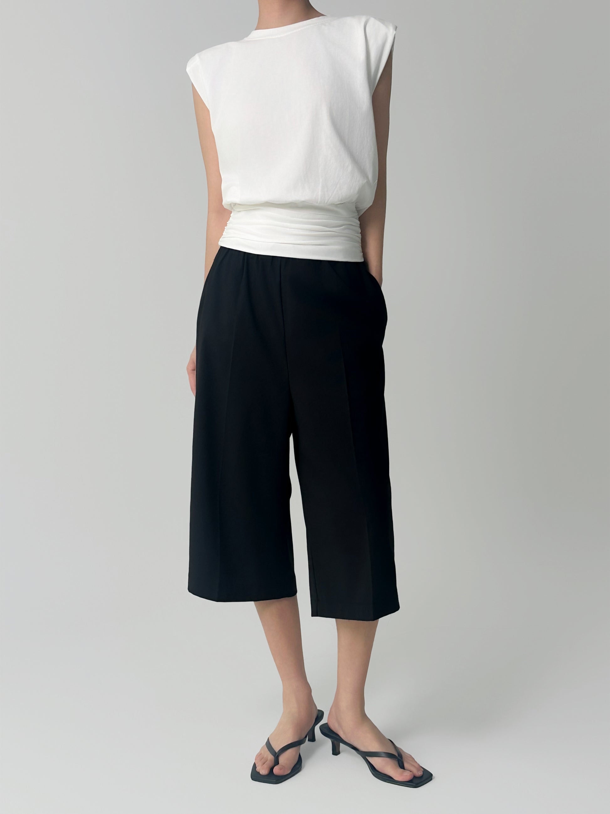 A refined essential with a subtle edge, the Ruched Silhouette Tee embodies modern minimalism. Tailored with clean lines and structured shoulder pads, it brings quiet strength and sophistication to your everyday wardrobe.